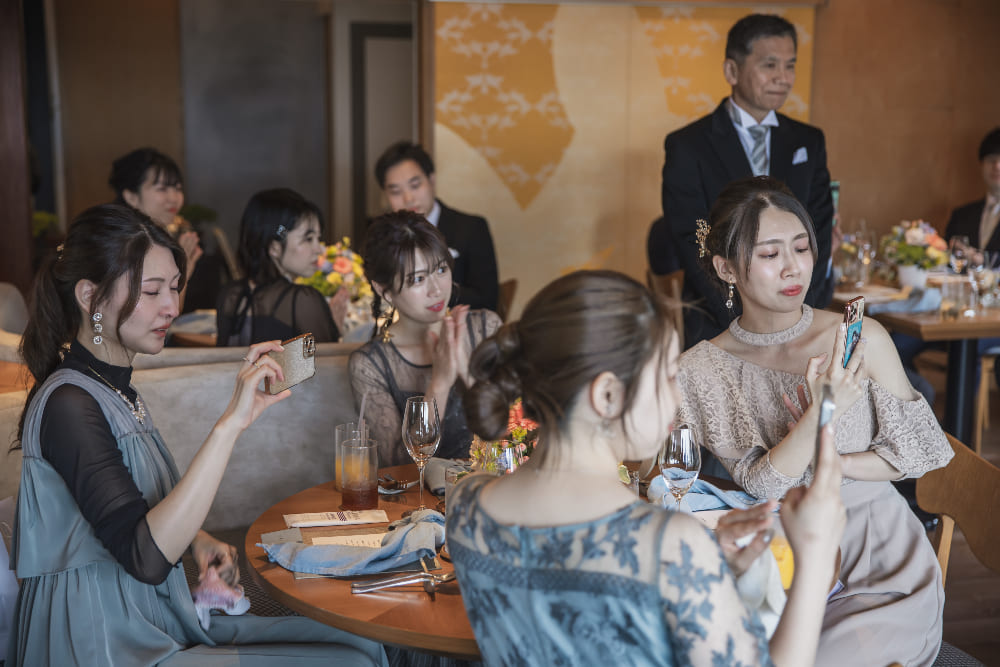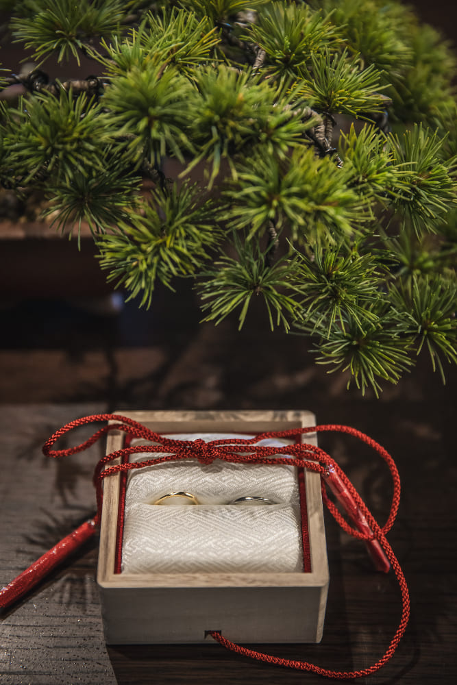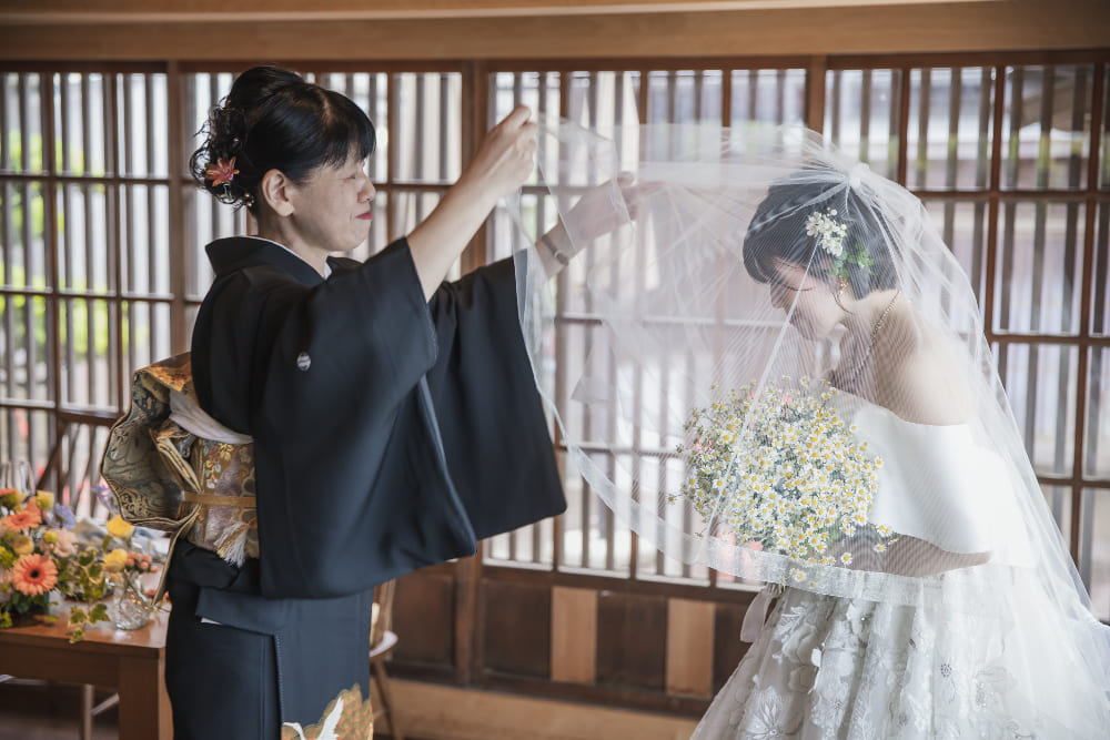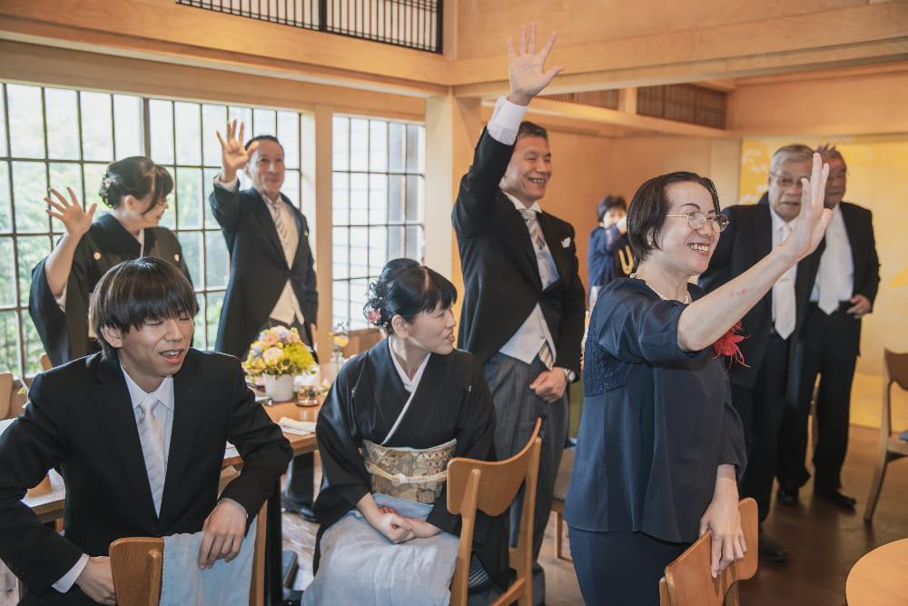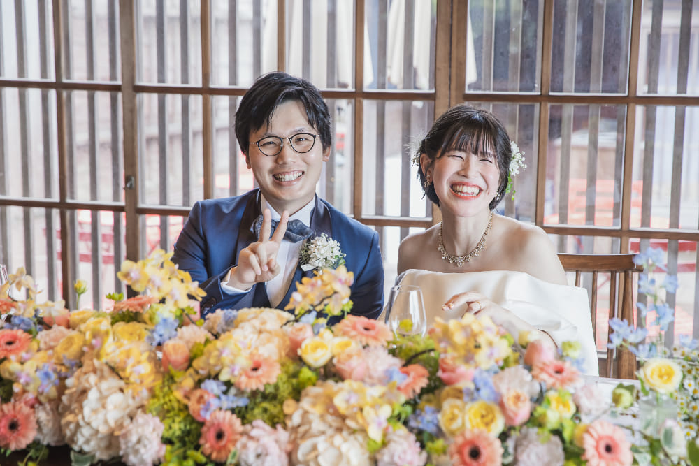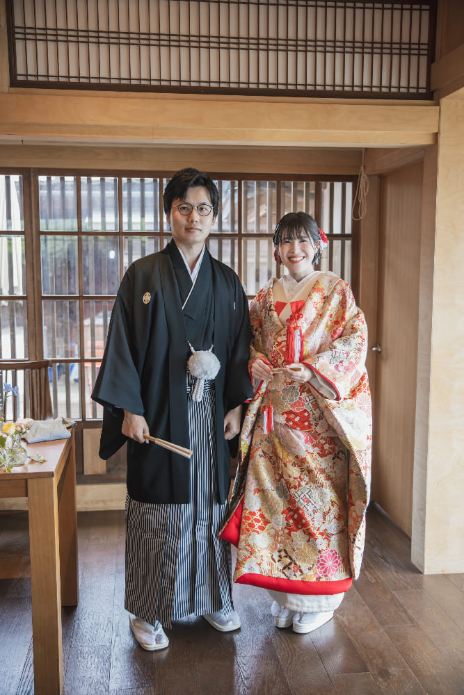 ウェルカム暖簾や盆栽など、和のテイストで会場を装飾しました。人前結婚式はタキシード&ウェディングトレスで行いましたが、大切な妹様や弟様をエスコート役に中座、お色直しの再入場は紋付羽織袴に色打掛をセレクト。フレンチレストランでの和装入場はゲストの皆さまにも大好評で、大きな歓声に包まれました!